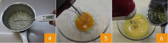 Just before reaching 250°F, once it reaches about 240°F 4, start beating the egg yolks with an electric whisk 5. Once the syrup reaches 250°F, pour it in a thin stream over the yolks 6, continuing to beat with the whisk.