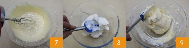 Beat until completely cool 7. In a bowl, slightly soften the mascarpone with a spatula 8. Gradually add the cooled beaten yolks to the mascarpone, mixing with a soft spatula with an upward motion 9