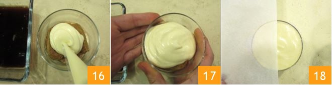 Pour another layer of cream 16 and continue layering in the same order until reaching the top 17, smoothing the surface well so it is even. For decoration: place a sheet on top of each glass, positioning it to divide the surface into two equal parts 18