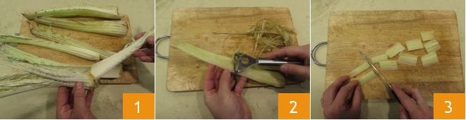 To prepare the Benevento cardoon, start by preparing the Chicken broth. In the meantime, proceed to clean the cardoon (gobbo variety): remove the outer and tougher ribs 1 keeping the inner ones, which are tender. Wash them thoroughly and remove the filaments using a vegetable peeler 2. Cut the ribs into pieces 3