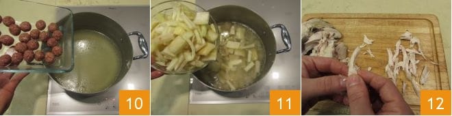 After draining the chicken, cook the meatballs in the pot with the chicken broth for about 10 minutes 10, then add the well-drained cardoons and cook for another 15-20 minutes 11. While the meatballs and cardoons are cooking in the broth, shred the chicken with your hands, reducing it into small strips 12.