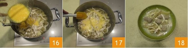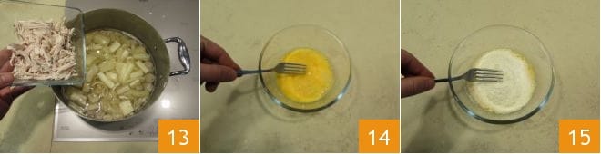 Add these to the broth as well 13. Finally, break the eggs into a bowl 14 and mix with a pinch of salt and grated Parmesan cheese 15.