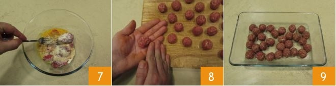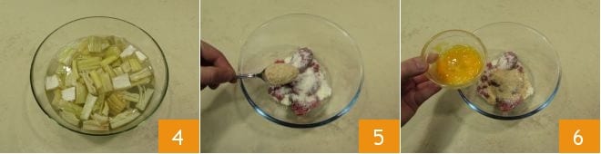 and immerse them in cold acidulated water, squeezing a lemon into it to prevent browning 4. Meanwhile, work on the meatballs. In a bowl, mix together the minced meat, salt, and pepper, grated Parmesan cheese, and breadcrumbs 5. Then add the slightly beaten eggs 6