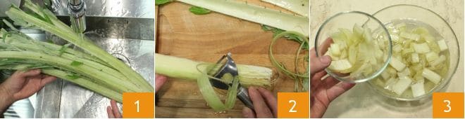 To prepare the cardoon flans, start by cleaning the cardoon: first, wash the cardoons under running water 1, then cut off the end of the bunch and separate the individual stalks, removing any leaves. Take one stalk, and if it's exceedingly large or wide, cut it in half lengthwise. With a knife, notch one end and pull from the opposite side to remove the filaments 2, repeat the same process on the other end. Then cut the cardoons into small pieces and place them in a bowl full of water 3, where you have squeezed the juice of one lemon (a procedure that will prevent them from browning).
