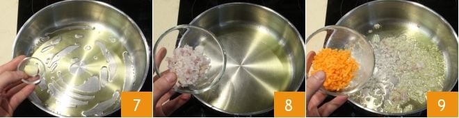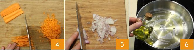 Now focus on the sauté that will serve as the base for cooking: wash, peel, and chop a carrot 4, peel the onion and finely chop it too 5, for further details consult the cooking school guide: How to make the soffritto. Place a large pan on the stove, pour a drizzle of oil 6,