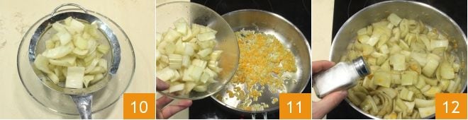 then drain the previously soaked cardoons 10 and add them to the pan 11. Stir with a spatula, salt 12, pepper and continue cooking until the cardoons become tender, which will take at least 40 minutes. If necessary, add a ladle of broth if the cardoons seem too dry.