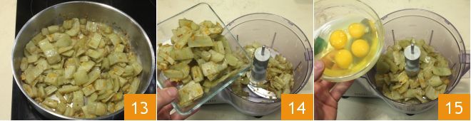 Once cooking is finished 13, turn off the heat, let them cool slightly, and then place the cardoons in a blender 14, add the eggs 15,