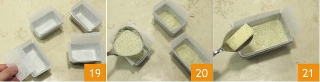 Cut out sheets of parchment paper to line the bottom and sides of the molds 19, make sure the paper adheres well, then pour the cardoon mixture with a ladle until halfway up 20, at this point fill half of the molds with a piece of cheese 21