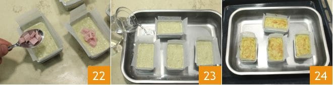 and the other half with a few cubes of cooked ham 22, pour one last ladle of mixture to cover the molds up to the brim. Proceed with cooking: get a large baking tray that can hold the molds and place them inside, pour water into the tray to immerse the molds by about ¾ inch 23. Bake in a preheated static oven at 350°F for about 35/40 minutes (or in a convection oven at 320°F for about 25/30 minutes). After this time, perform the toothpick test, which should come out dry. Once cooked, remove from the oven 24 and turn them out onto a serving plate to unmold. Your cardoon flans are ready to be enjoyed!