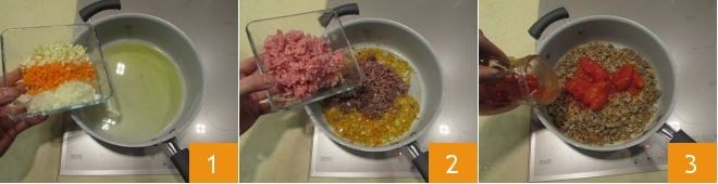 To prepare the cardoon parmigiana, start by cooking the tomato sauce with meat. So clean and finely chop celery, carrot, and onion with a knife, and sauté all in a pot where you have poured some extra virgin olive oil 1. Then add the ground veal and pork 2 and sear for a few minutes, then add the tomato pulp 3.