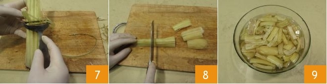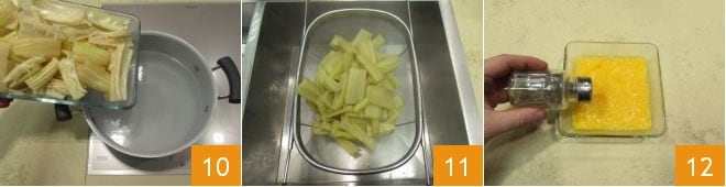 Reach the more tender and flavorful inner stalks, then remove the strings with the help of a vegetable peeler 7 and cut into pieces of 2.5-3 inches, making the cooking uniform 8. Immediately immerse the cardoon pieces in cold acidulated water 9, where you have squeezed the juice of one lemon, to prevent them from browning.