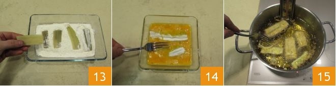 flour the cardoon pieces 13 and then dip them in the eggs 14. Fry them, a few at a time, in a pot with hot seed oil (check with a kitchen thermometer that it does not exceed 340-355°F) for about 4-5 minutes, or until a golden crust forms on the surface 15.