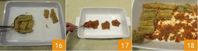 As you cook them, drain them on absorbent paper to soak up the excess oil 16. Sprinkle the bottom of a 12x8 inch baking dish with some sauce 17, spreading evenly, and then lay the fried cardoons side by side 18.