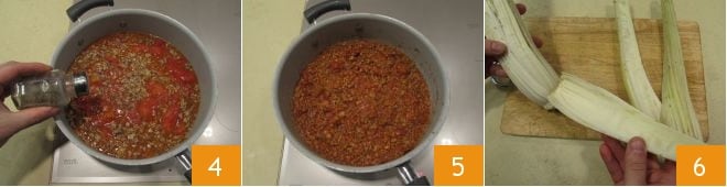 Adjust with salt and pepper 4 and let everything cook for 30 minutes over medium heat. The sauce will be ready once you have reached your preferred consistency 5. In the meantime, proceed with cleaning the cardoons. Remove the outermost stalks, which are very tough and bitter 6.