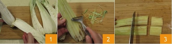 To make the cardoon soup, start by preparing the broth following our Beef Broth recipe. Now take care of cleaning the cardoons: remove the outer leaves 1, trim the ends, and use a vegetable peeler to remove the strings 2. Cut the stalks into pieces about 2 inches 3, you should get about 1.5 lbs,