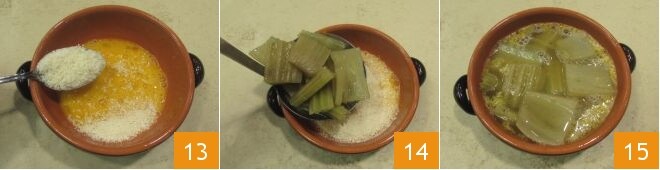 season with grated cheese 13 and add the drained cardoons 14, finish the dishes by pouring the hot broth 15. Your cardoon soup is ready to be enjoyed hot!