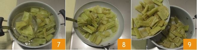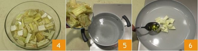 fill a bowl with water and squeeze lemon juice into it. As you cut the cardoon stalks, immerse the pieces in the acidulated water to prevent them from turning brown 4. Now, in a pot, bring salted water to a boil, immerse the cardoons drained from the soaking water 5 and blanch them for a couple of minutes, leaving them al dente. In a pan, melt the butter with the olive oil 6;