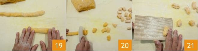 Retrieve the gnocchi dough from the fridge, divide it into pieces, and handle them to create small logs 19; with a dough scraper or the slightly floured blade of a knife, make the gnocchetti 20, to which you can give the typical grooves using a gnocchi board 21 or by passing the gnocchetti over the tines of a fork. As you make them, place the gnocchetti on a slightly floured tray.