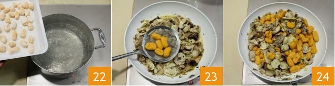 Once ready, cook the gnocchi in a large pot with plenty of salted water to taste 22: it will take just a few moments, when the gnocchi rise to the surface, drain them with a skimmer and transfer them directly into the pan with the sauce 23. Sauté them for a few seconds over low heat, season with pepper, and mix to enhance the flavor, and your carrot gnocchetti with mixed mushrooms will be ready to enjoy!