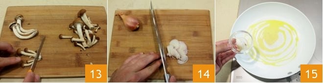 For honey mushrooms, cut off the stem end 13, rinse under running water, and boil for at least 15-20 minutes in plenty of boiling water, occasionally skimming off the surface residues with a skimmer. Once the mushroom cleaning is complete, peel and chop a shallot 14, then pour oil and a whole garlic clove (which you can remove afterward) into a large pan 15.