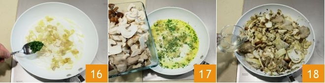 Let the shallot soften and the garlic clove brown over low heat, then add the chopped parsley 16 and mushrooms 17; sauté them for a few minutes then deglaze with white wine 18, let it evaporate, and turn off the heat.