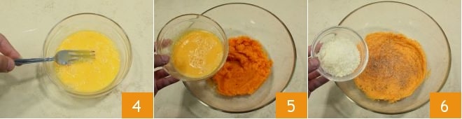 then crack the eggs, beat them with a fork 4, and add them to the carrots 5; mix, then add the grated pecorino cheese 6,
