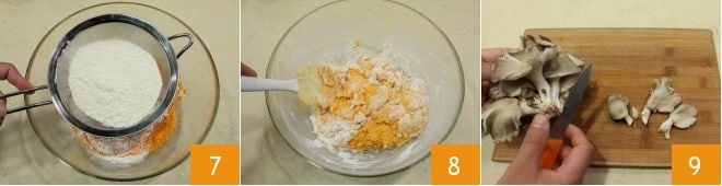 the nutmeg, and the sifted flour 7. Mix the mixture with a spatula 8 and cover it with plastic wrap to let it rest in the refrigerator for at least half an hour. Meanwhile, prepare the sauce by cleaning the mushrooms: with a kitchen cloth, clean the surface of the pleurotus mushroom caps and the stem to remove soil, then with a small knife separate the stems from the cluster 9, and if necessary, go over the caps and the internal gills with the cloth to remove any remaining soil.