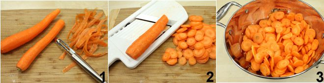 To prepare the carrots with milk, wash and peel the carrots 1, then slice them into rounds 2 about 1/8 inch thick 3.