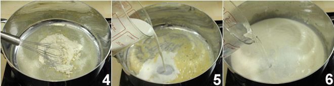 Melt 2 tablespoons of butter in a wide, shallow pan, then add the flour 4, stir, and then add the milk 5 and the water 6,