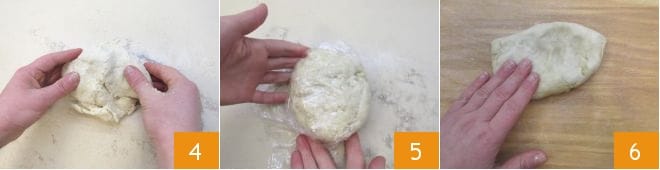 Knead by hand until you get a compact consistency 4. Form a loaf and wrap it with plastic wrap 5; let it rest at room temperature for about 30 minutes. After this time, take back the dough, remove it from the plastic wrap, take about half at a time and flatten it slightly on the work surface 6