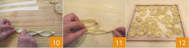 and from them, strips about 1 1/4 inches wide and 12-14 inches long. Now take each strip of dough and pinch the two edges of the short side together, sealing with finger pressure, to create little pockets spaced about 1 1/2 inches apart 10. Now roll the strips onto themselves forming roses, remembering to pinch the spiral in some points to prevent the cartellate from opening during frying 11. Once formed, place your cartellate on a rack 12 or on a board, covered with a dry and clean cloth, to let them dry: 5-6 hours should be sufficient but, if you can, better overnight.