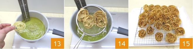 It's time to fry the cartellate: heat an abundant amount of seed oil in a high-sided pot, and when it reaches 340°F (use a kitchen thermometer to measure the correct temperature), immerse a few cartellate at a time 13. Fry the cartellate for 3-4 minutes per side, then drain them 14 and let them dry on a rack so they stay crispy 15.