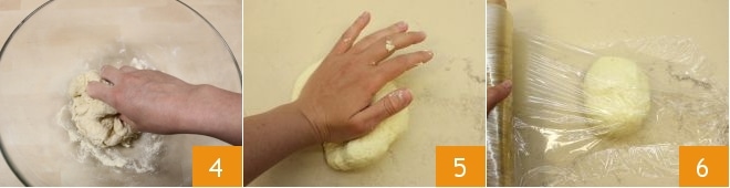 Start kneading 4 vigorously with your hands. Transfer the dough onto a floured work surface and continue kneading by hand until you obtain a smooth and homogeneous dough 5, which you will wrap in plastic wrap 6 and let rest for 30 minutes outside of the fridge. If you want more information on the preparation and storage of cavatelli, consult the Cooking School: cavatelli, which you can find Cavatelli.