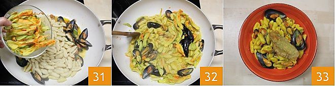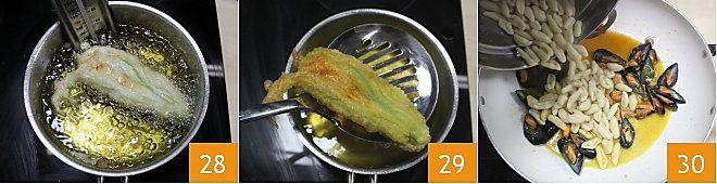 Heat the seed oil (preferably peanut oil) in a small pot, and when it is hot, i.e., when it reaches a temperature of about 356°F, immerse the stuffed zucchini flowers 28. Let them fry for a few minutes, and when they are golden and crispy, drain them with a slotted spoon 29 and let them dry on a tray covered with paper towels. After the 3-4 minutes of cooking, drain the cavatelli and add them to the sauce with the mussels, where you will continue cooking for another two minutes over high heat to concentrate the sauce and flavor the cavatelli 30.