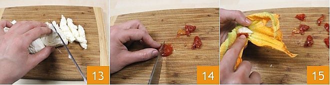 Prepare the ingredients that will fill the zucchini flowers to decorate the plate: place the burrata on a cutting board and slice it into small enough pieces to stuff the zucchini flower 13. Then, also cut the dried tomatoes in half 14, and if using oil-packed dried tomatoes, dry them with a paper towel before cutting. Now choose 4 large zucchini flowers to fill from the total amount. Place them on a cutting board and remove only the excrescences and the stem, keeping the lower cup to prevent the filling from leaking out. Gently spread them apart and stuff them with a slice of burrata and a halved dried tomato 15. Twist lightly to close them and set them aside in the fridge after placing them on a plate.