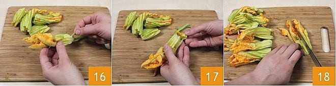 Now clean the zucchini flowers that you will incorporate into the sauce with the mussels. Wash the flowers thoroughly by gently immersing them in cold water, then drain and place them to dry on a dry cloth with which you will lightly pat them. Transfer them to a cutting board and remove the stem and excrescences 16. Extract the fleshy pistils inside 17 and cut the flowers longitudinally into strips 18. Set them aside in the refrigerator; you will add them at the end because their cooking is quite short.