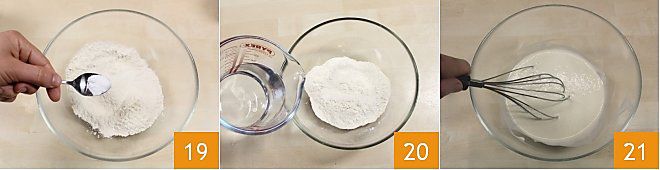 Now prepare the batter for the zucchini flowers that will decorate the plate: place the sifted flour in a bowl, add the baking soda 19, a pinch of salt, and the sparkling water 20. Stir vigorously with a whisk to prevent lumps 21 and store the batter in the fridge covered with plastic wrap until ready to use.