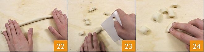 After the 30 minutes of rest for the dough, take out the dough ball, transfer it to a work surface dusted with semolina flour. Take a piece of dough at a time and roll it, forming ropes about 0.4 inches in diameter 22. Cut the rope into many small pieces of about 0.4 inches 23 and indent each piece by pressing it with your fingertips inward 24. At this stage, it is important to keep the rest of the dough covered with plastic wrap to prevent it from drying out.