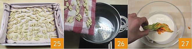 Cover a tray with a tea towel, sprinkle it with semolina, and transfer the cavatelli to it 25. Fill a large pot with plenty of salted water, bring to a boil, and add the cavatelli. Cook for about 3-4 minutes, checking the cooking with a taste test 26. While the cavatelli are cooking, take the batter out of the fridge and coat the stuffed zucchini flowers 27.