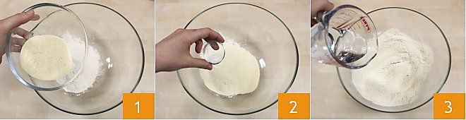 To prepare the cavatelli with zucchini flowers, mussels, and saffron, start by making the pasta: take a bowl, pour in the all-purpose flour and semolina flour 1. Then add a pinch of salt (optional) 2, water 3, and oil.