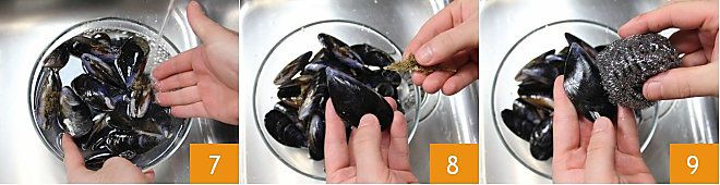 While the cavatelli dough is resting, focus on the mussels: transfer them to a large bowl and wash them thoroughly under running water 7. With a vigorous motion, manually detach the beard, or byssus, that protrudes from the shells 8. Then, still under fresh running water, scrub the mussels vigorously to remove any impurities, using a steel wool pad or a stiff brush 9. Discover with the Cooking School: how to clean mussels, how to perform this operation best.