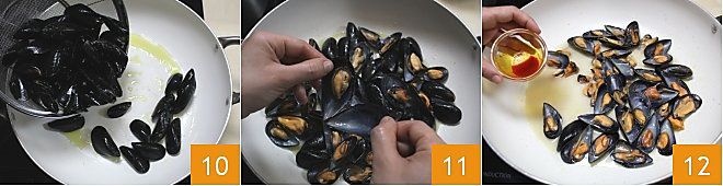 Then take a large non-stick skillet and heat a drizzle of oil with a peeled garlic clove. When the garlic is golden, add the cleaned mussels 10. Cover with a lid and cook over medium heat; after about 5 minutes, the mussels will open. At this point, turn off the heat and remove the shells with your hands 11, leaving only 8 with the shell, the most beautiful and large ones, for decorating the plates. Now dissolve the saffron with a tablespoon of the mussel cooking liquid and add it to the skillet 12, then stir until the sauce is colored. Add salt and pepper to taste, and if desired, add chopped parsley.