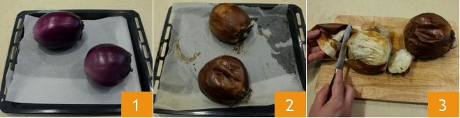To prepare the eggplant caviar, wash the eggplants under plenty of fresh running water, then dry them. Place them on a baking sheet lined with parchment paper without piercing them 1. Bake in a static oven preheated to 356°F for at least 60 minutes (or at 320°F for 50 minutes if in a convection oven). After this time 2, remove the eggplants from the oven, and with a knife, remove the skin 3 and