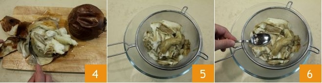 with a spoon, scoop out the flesh inside them 4. Place the obtained flesh on a fine-mesh strainer 5 and press it down with the back of a spoon 6,