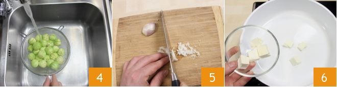 Wash the sprouts thoroughly under running water 4 and let them drain. Peel and chop the shallot 5, then sauté it in a non-stick pan with the butter 6.