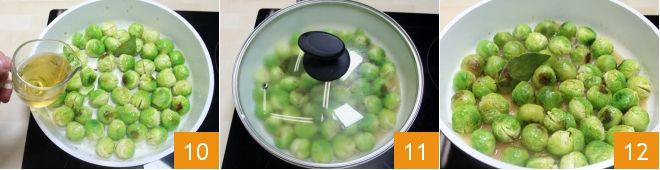 Deglaze the sprouts with beer 10 and let it evaporate for 3 minutes. Salt and pepper, cover with a lid, lower the heat, and let cook for about ten minutes 11. Remove the lid, increase the heat, and cook for another 5 minutes, stirring occasionally to prevent the sprouts from sticking to the bottom 12. The braised Brussels sprouts with beer are ready!