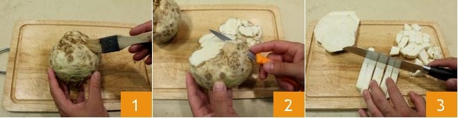 To prepare the celery root puree with cream, brush the celery root with a brush to remove any excess dirt on the outer surface 1; peel it with a knife 2, then cut it into chunks 3.