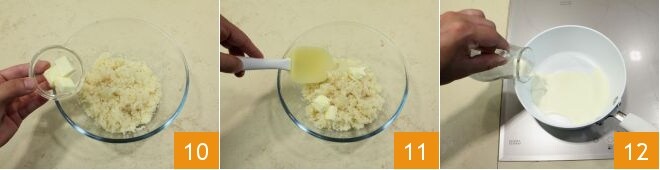 the butter cut into pieces 10, then mix with a spatula to combine all the ingredients well 11. Place a small saucepan with the cream on the stove 12;