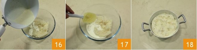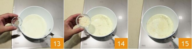 add salt, pepper 13, and grated cheese 14. Bring to a simmer, stirring well with a spatula or a wooden spoon 15.