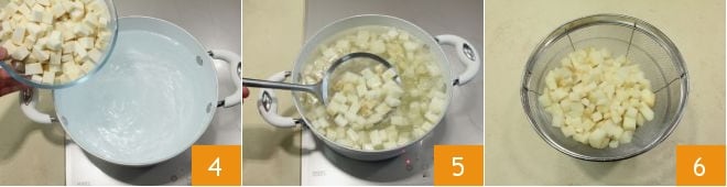 Place a large pot with plenty of salted water on the stove, and when the water reaches a simmer, blanch the celery root for 10 minutes 4; when it is ready 5, drain it well using a fine mesh strainer 6.